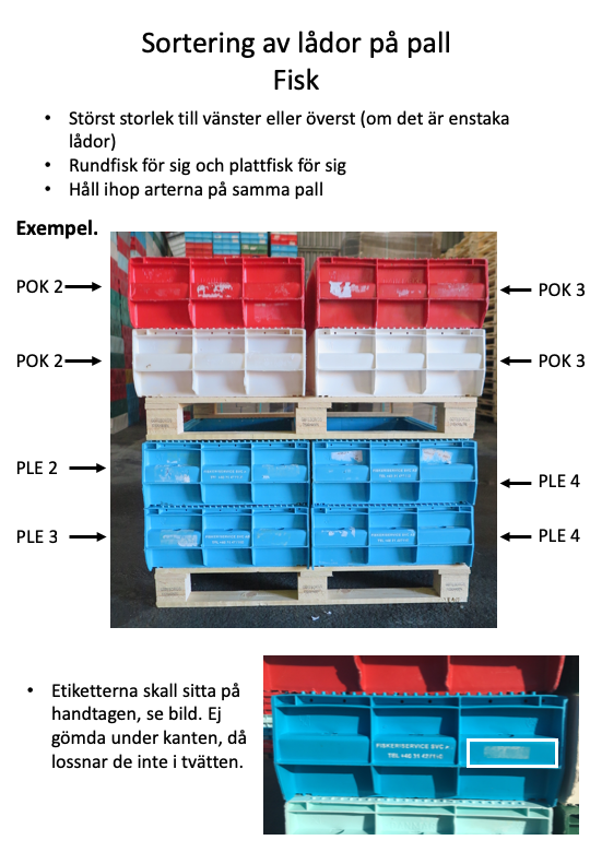 För att underlätta arbetet för nattpersonalen vid auktionen att sortera lådorna enligt exempel i bilderna nedan. Ibland kommer många leveranser samtidigt och för att alla lådor skall hinna ställas på plats innan auktionens start är detta av stor vikt.