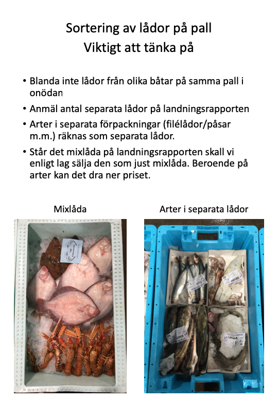Vi jobbar just nu med att ta fram en korrekt lådetikett. Det är viktigt att informationen på lådan är korrekt då vi både får kontroller från Havs och Vattenmyndigheten samt från Miljöförvaltningen. I slutändan kommer inte lådor att kunna säljas om de inte är korrekt märkta. Mer information om detta kommer inom snar framtid. Här nedan finns den information som vi vill skall stå med på lådetiketten. Övrig obligatorisk märkning kommer att ligga på följesedeln ut till kund och bygga på den information som lämnas i landningsrapporten.