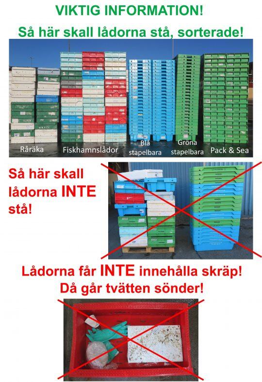 Eftersom många olika typer av lådor tvättas i lådtvätten är det viktigt att lådorna sorteras rätt. Se bild.