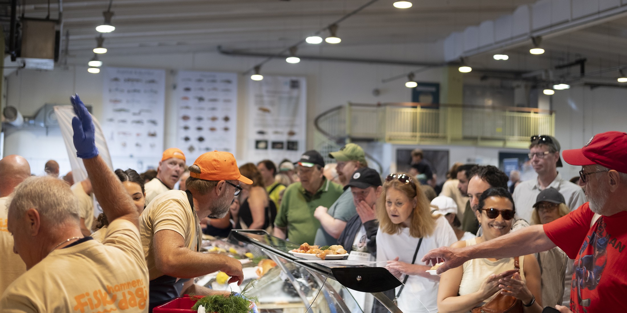 Inne i auktionshallen hittar du Sveriges största fiskdisk där du bland annat kan köpa med dig fisk och skaldjur hem.